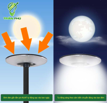 - Đèn mặt trời UFO hoạt động theo chế độ cảm biến ánh sáng và cảm biến chuyển động. Bên cạnh đó đèn UFO này còn được trang bị cả điều khiển từ xa lên tới 10m.